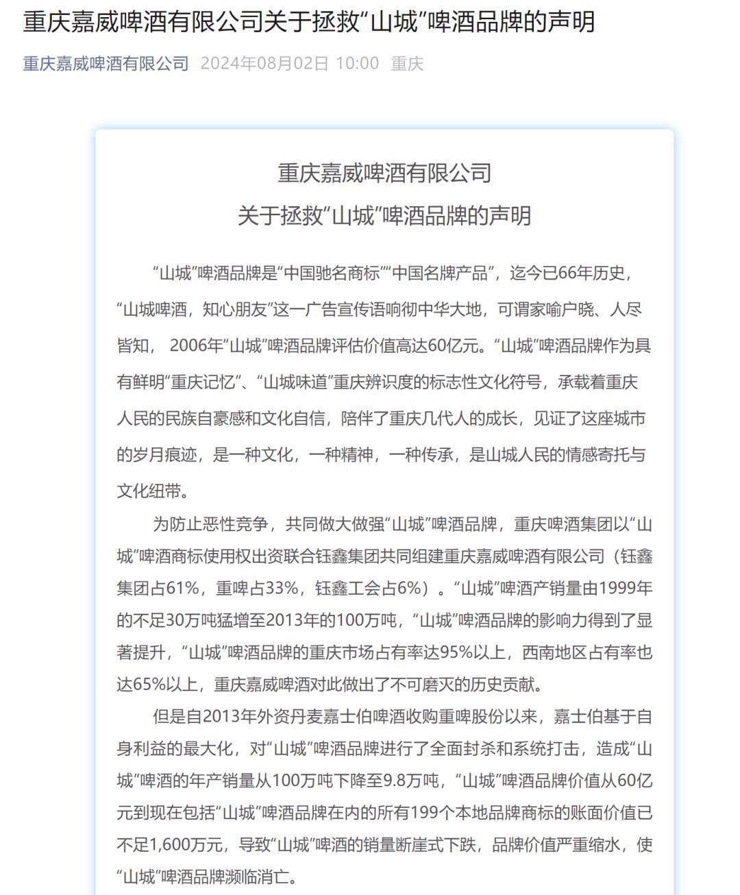 此外,去年8月,重啤多年的合作伙伴、拥有山城啤酒品牌使用权的重庆嘉威公司发布声明,称嘉士伯重啤雪藏民族品牌,掀起轩然大波。